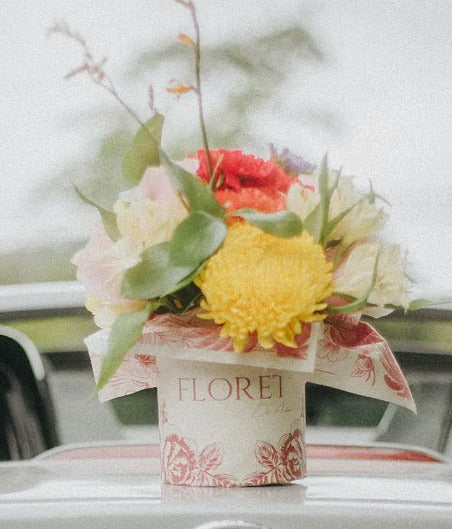 Nuestro cilindro de lujo mini tiene una selección de flores y colores donde cada flor amarilla representa la calidez de una sonrisa compartida, la complicidad de los recuerdos y la gratitud hacia quienes hacen de la vida un camino más brillante.