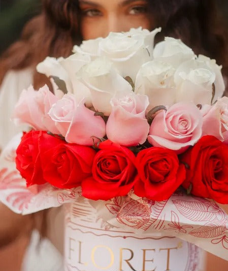 Nuestro bucket de lujo grande con 65-67 rosas y mediano con 48-50 rosas en degrade blanco, rosado y rojo incluye tarjeta dedicatoria en sobre postal y folleto informativo.